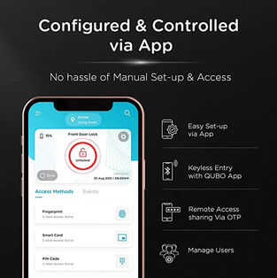 - Register upto 50 Fingerprints. Get 2 RFID Access Cards. Keep a tab with Activity logs via BLE Qubo Mobile App. Use Pincode with decoy digits to keep your code spy safe